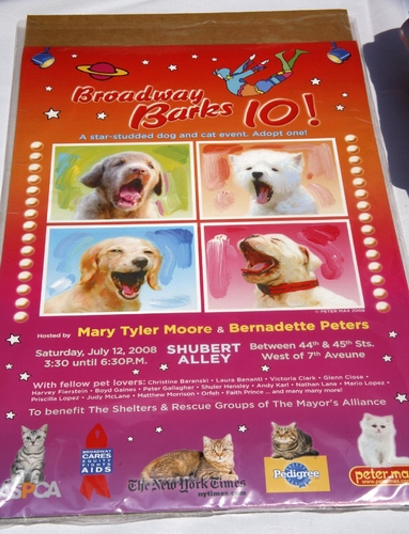 Mary Tyler Moore and Bernadette Peters hosted the tenth annual BROADWAY BARKS!, a star-studded dog and cat adopt-a-thon benefiting New York City animal shelters and adoption agencies. The event, produced by Broadway Cares/Equity Fights AIDS and sponsored by the ASPCA and PEDIGREE® with additional sponsorship by the New York Times took place on Saturday, July 12h in Shubert Alley (located between 44th and 45th Streets, between Broadway and Eighth Avenue). The festivities begin at 3:30 p.m.; celebrity presentations of pets from citywide animal shelters will take place between 5:30 - 6:30 p.m.