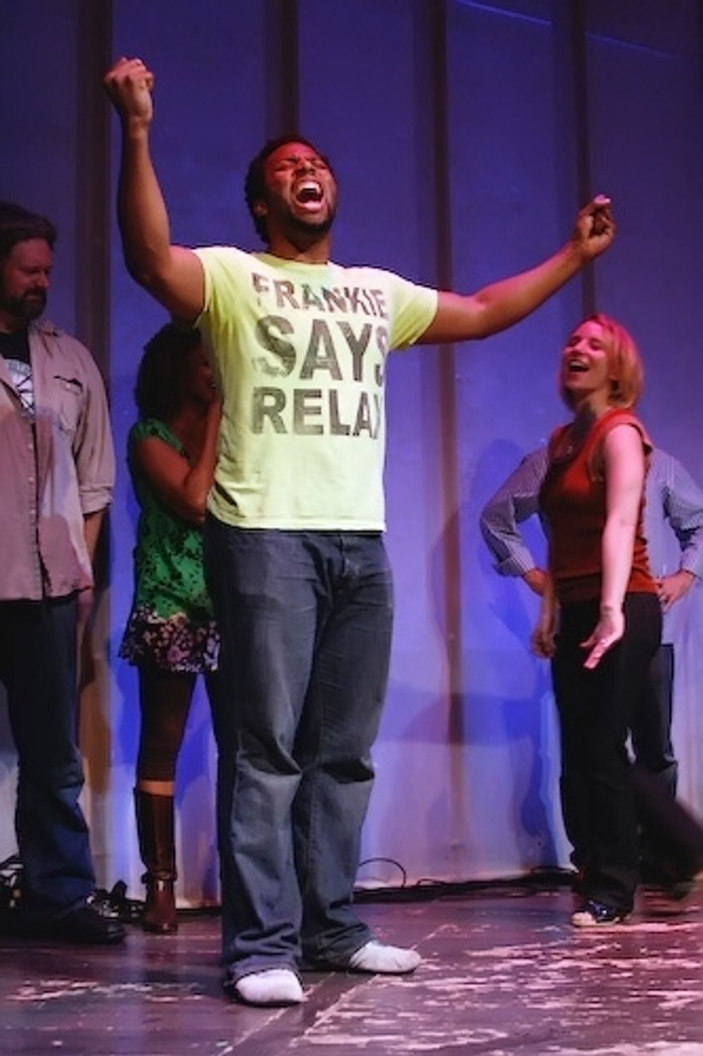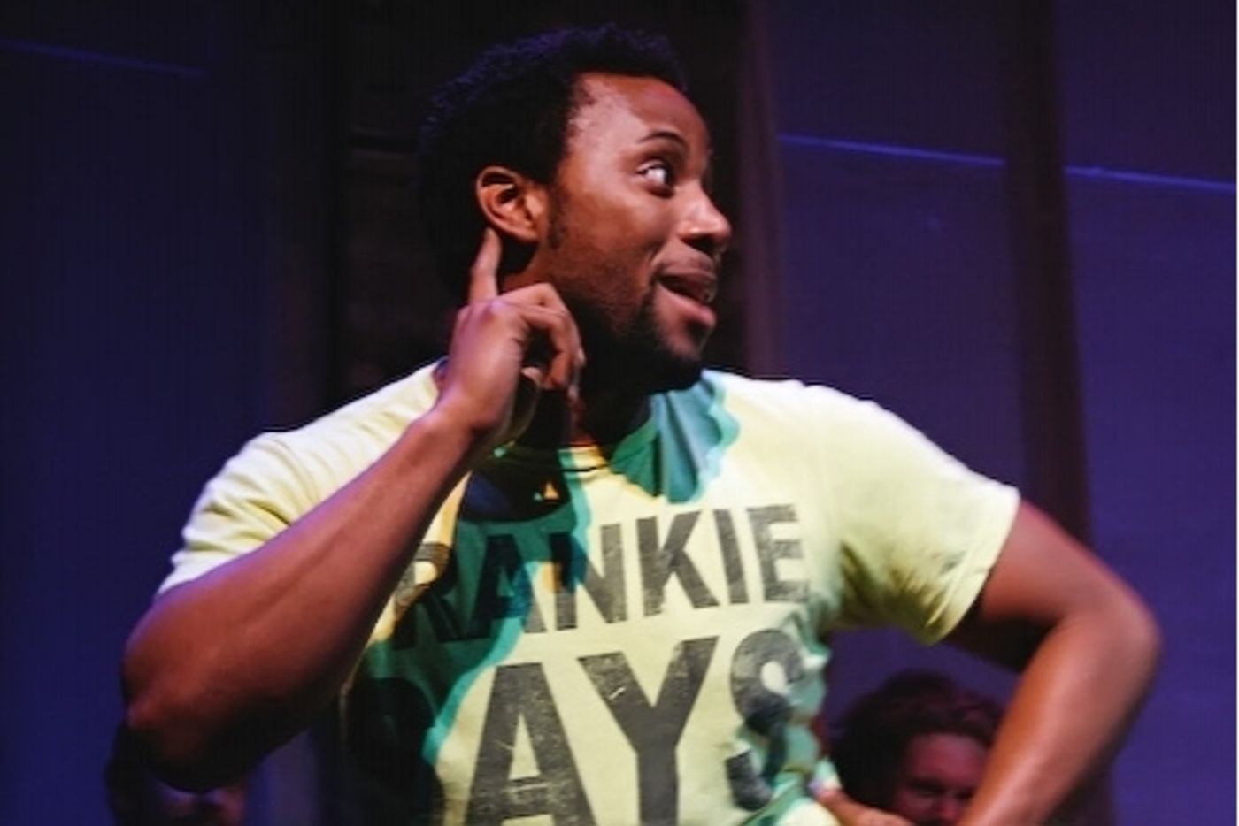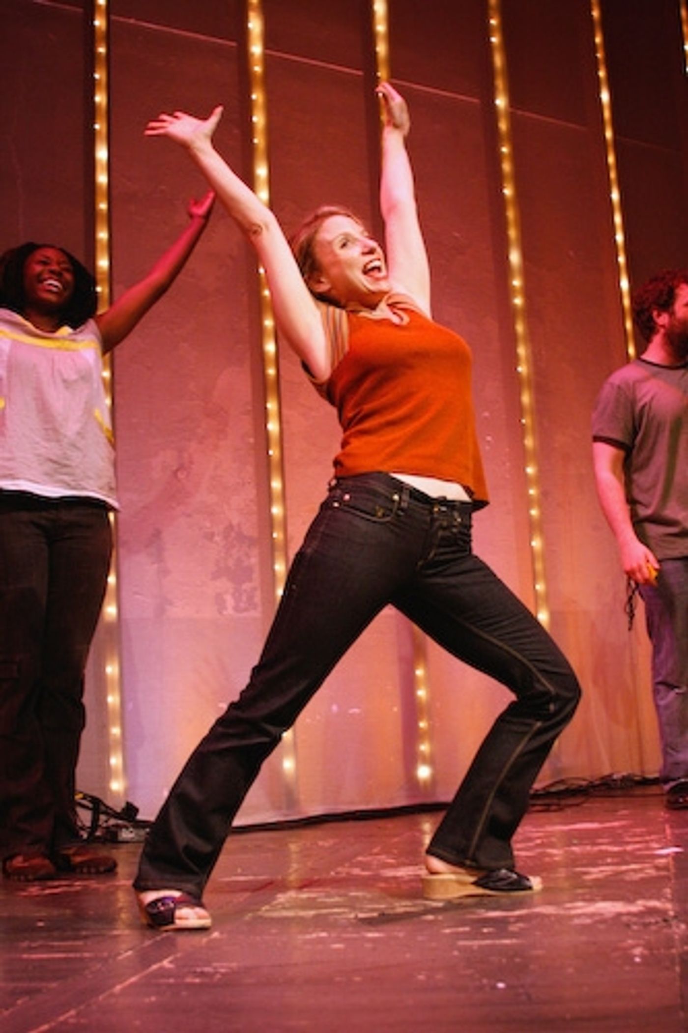 Vasthy Mompoint, Jason Kravits, and Gibson Frazier reenact a scene from the musical I Broke My Pogo-Stick