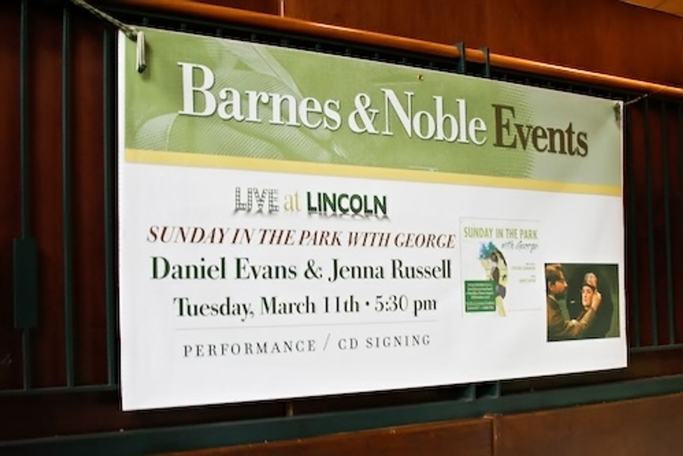 In celebration of the Broadway production of Sunday in the Park with George, Olivier Award winners Daniel Evans and Jenna Russell appeared at Barnes & Noble (Broadway and 66th Street) on Tuesday, March 11th for a special performance and CD signing beginning at 5:30pm.