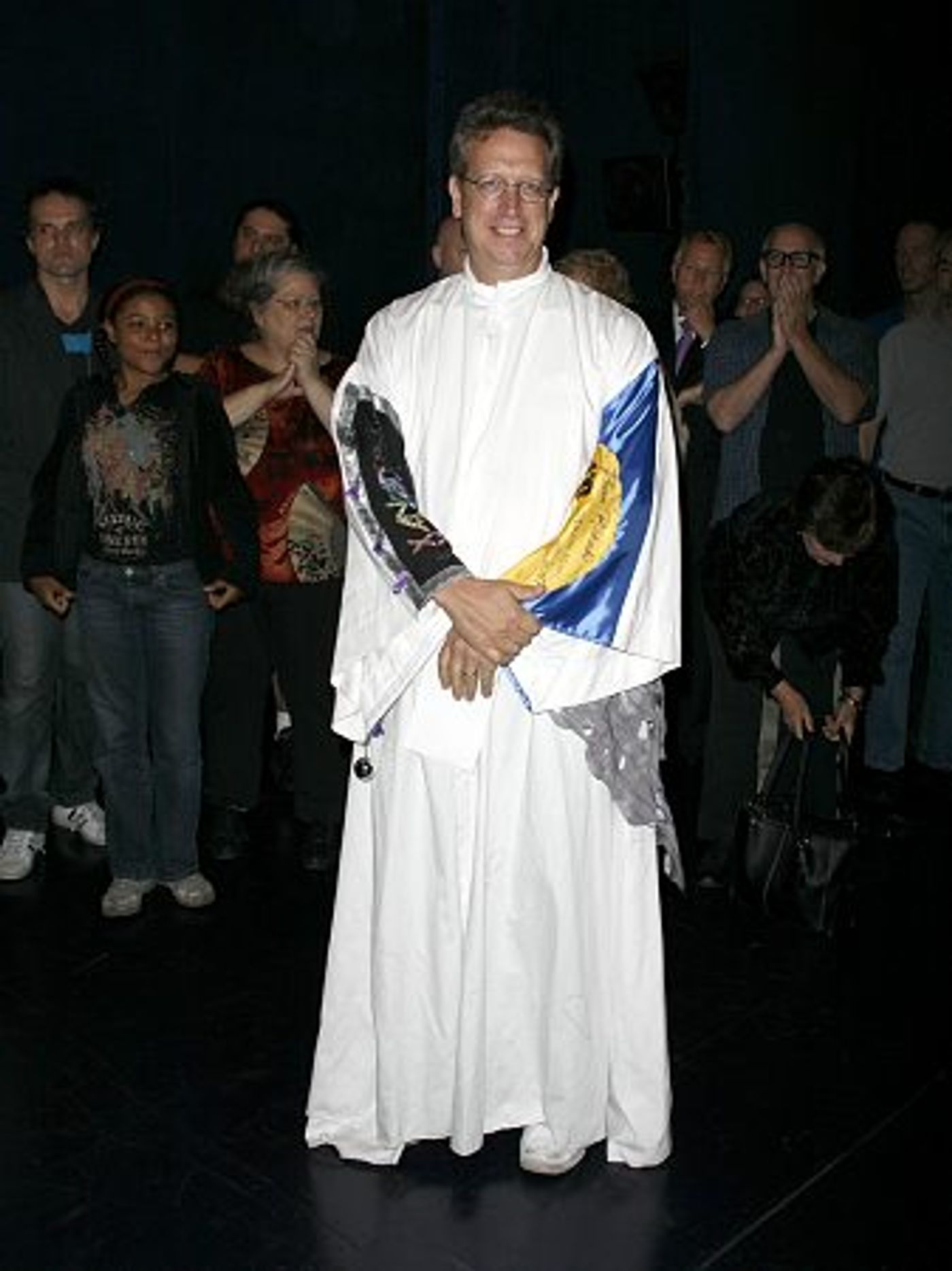 The colorful Gypsy Robe, embellished with mementos from Broadway musicals, is presented to the cast member who has the most Broadway chorus credits. Previous Gypsy Robe recipient, Peter Samuels (Secret Garden, Marie Christie) was on-hand to present the traditional theatre garb to Stone.