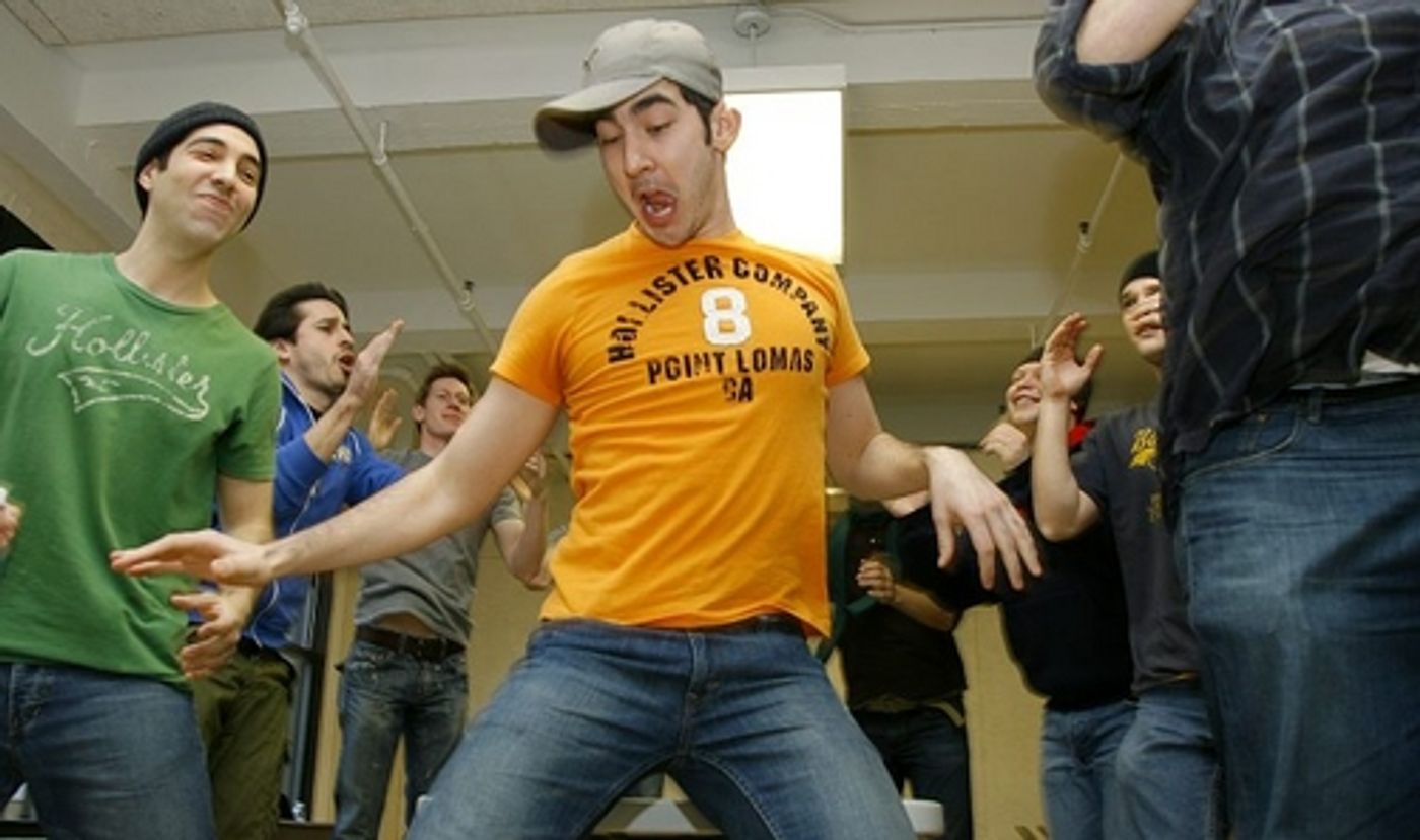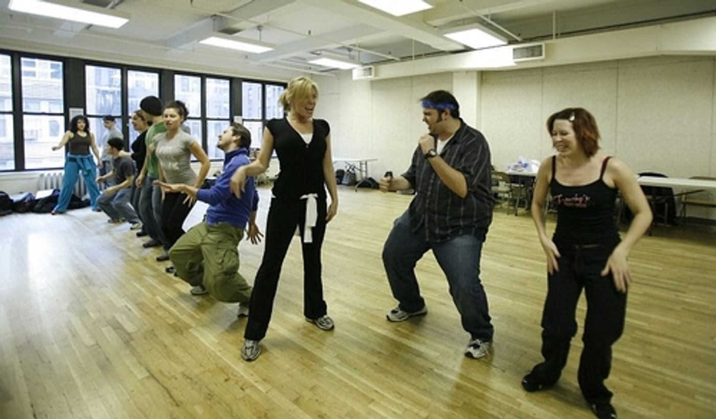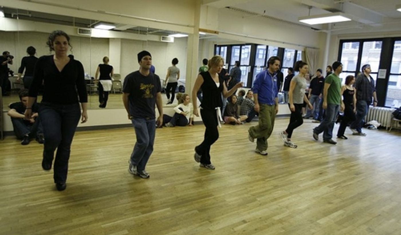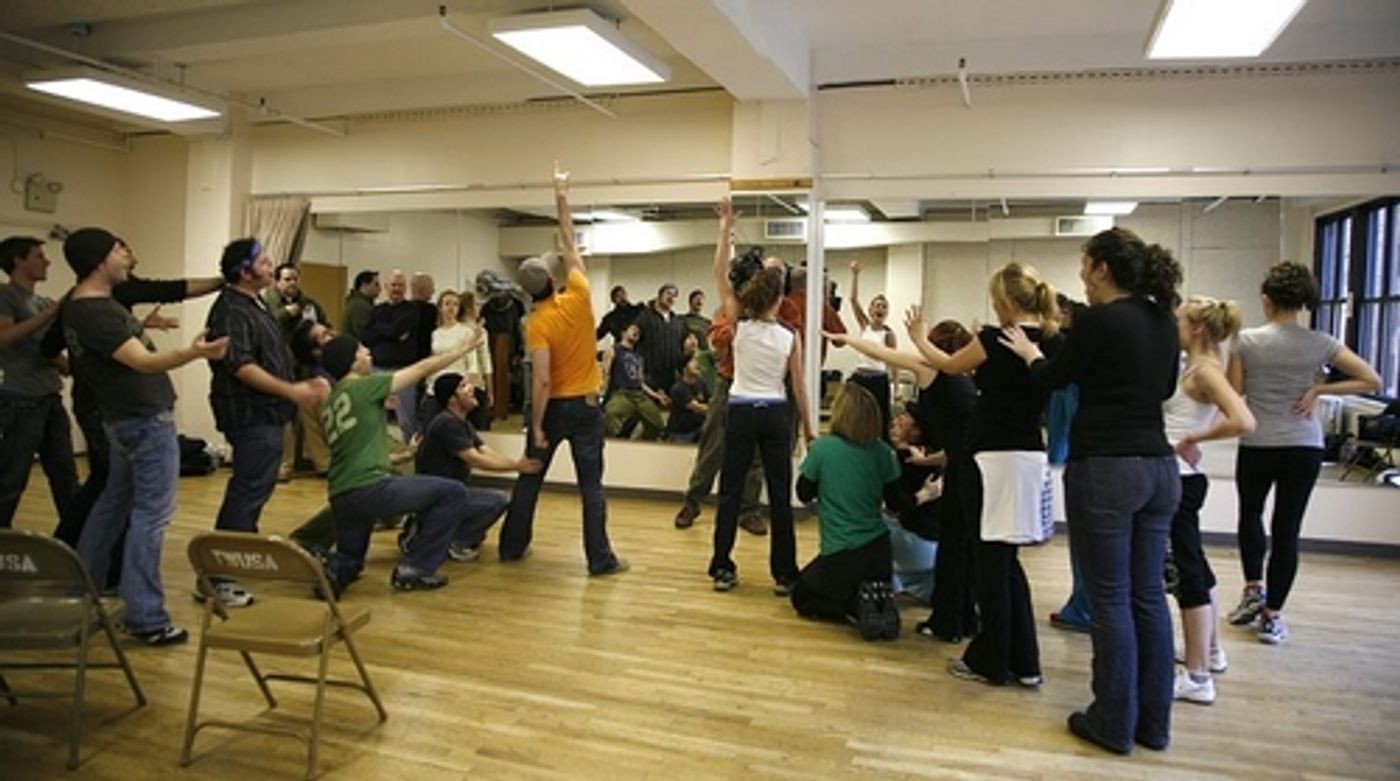 Max Crumm and Laura Osnes, stars of the new Broadway revival of Grease, rehearsed a few numbers in Chelsea Studios with the rest of their spirited cast on Thursday, November 29 to brush-up on their routines. The cast returns to the Brooks Atkinson Theatre 19-days after their musical was halted by the stagehands' strike.