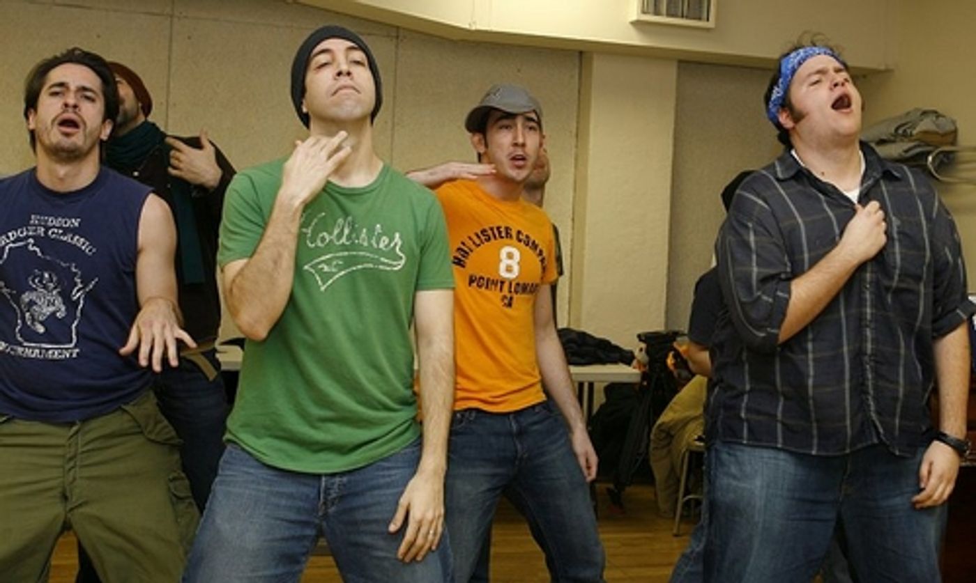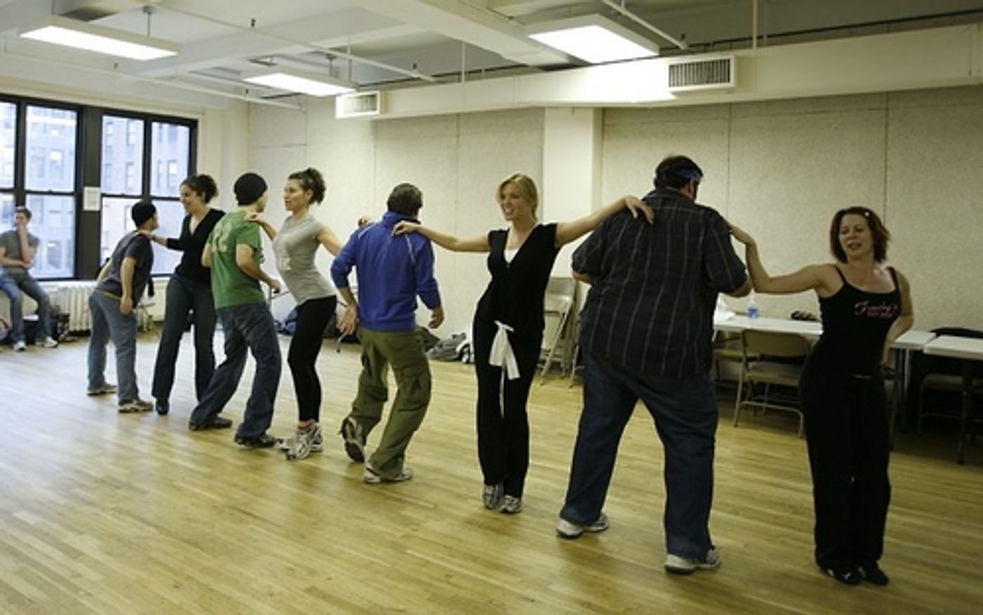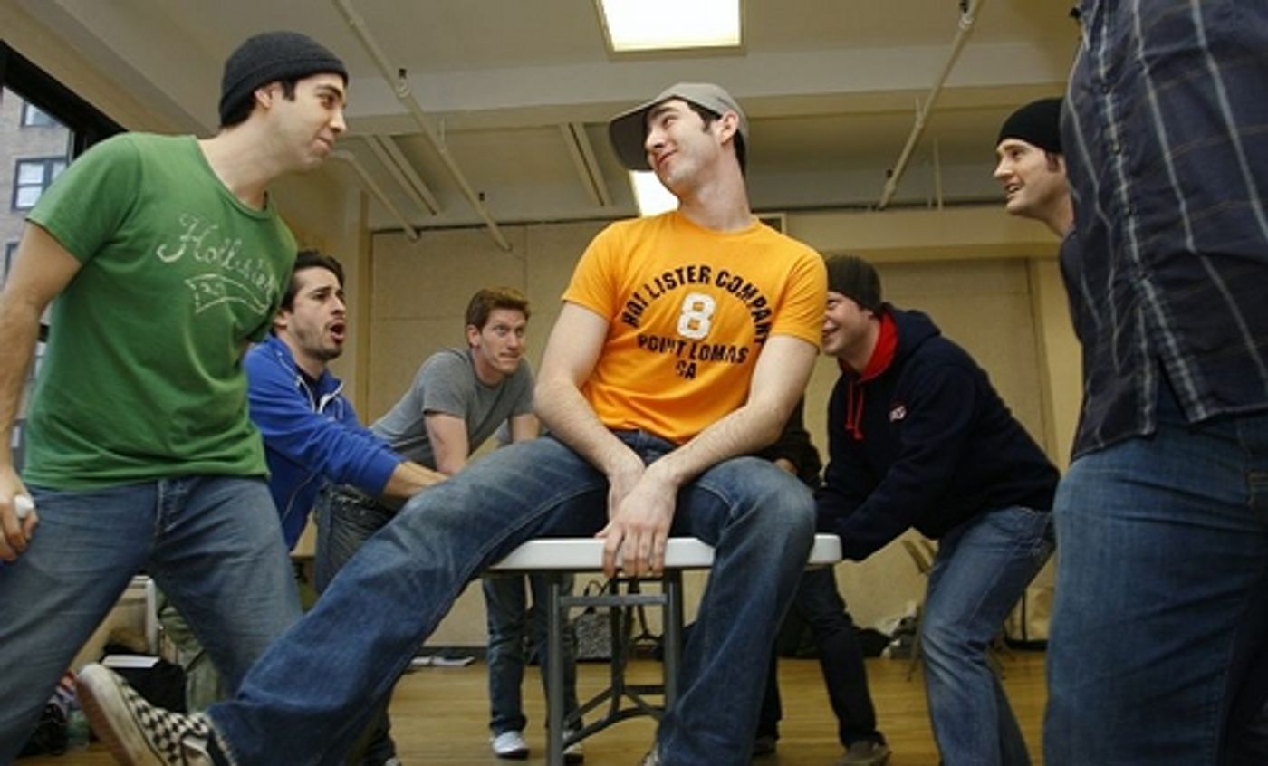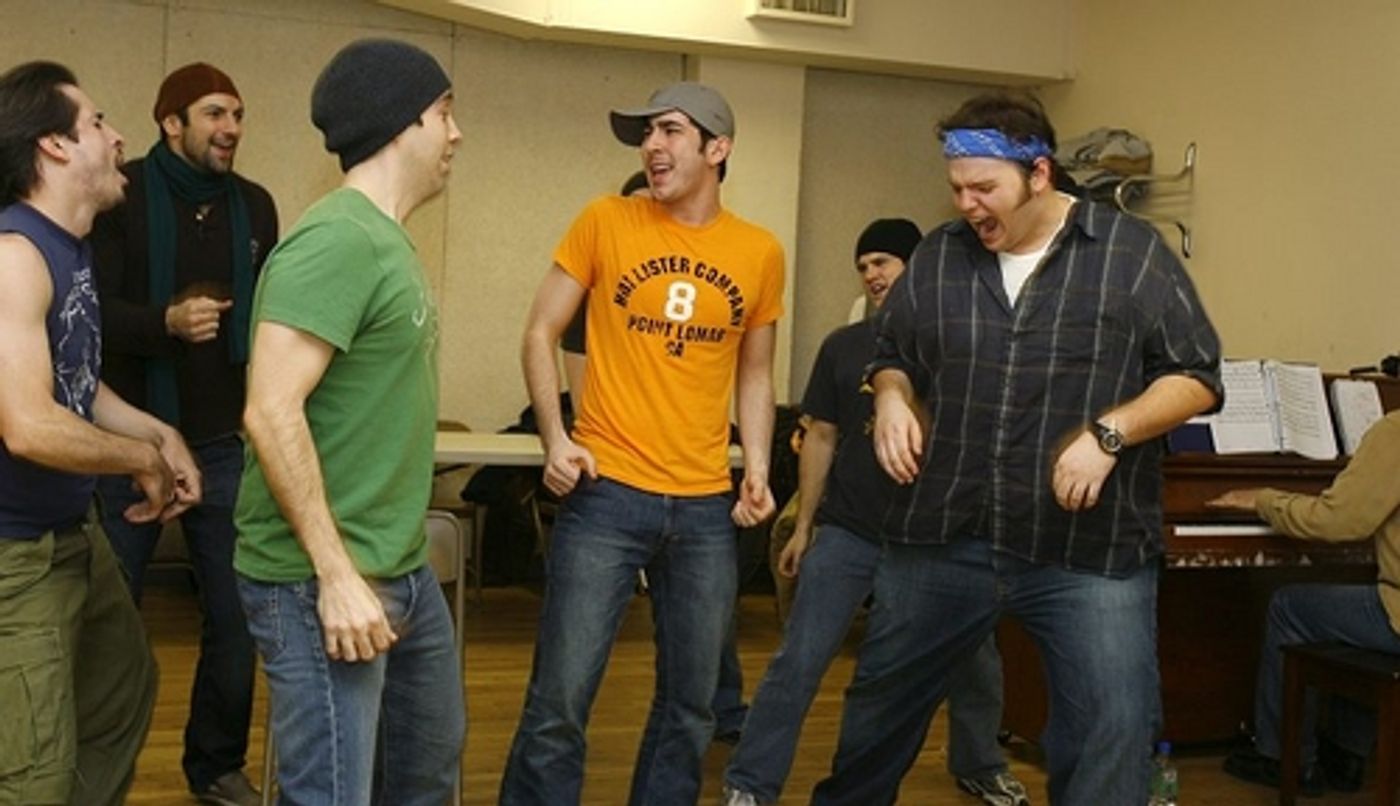 Max Crumm and Laura Osnes, stars of the new Broadway revival of Grease, rehearsed a few numbers in Chelsea Studios with the rest of their spirited cast on Thursday, November 29 to brush-up on their routines. The cast returns to the Brooks Atkinson Theatre 19-days after their musical was halted by the stagehands' strike.
