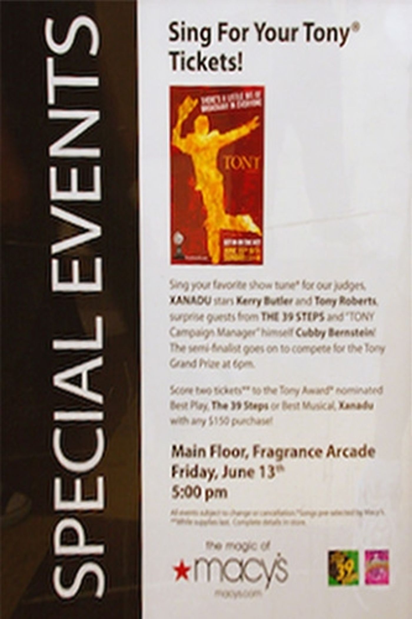 In celebration of this season's best and brightest Broadway productions, Macy's and the Tony Awards hosted a "Sing For Your Tony Tickets" talent competition at locations nationwide, followed by finals at the World's Largest Store, Macy's Herald Square. Aspiring Broadway stars got a shot to earn their way to this year's hottest ticket in town the 2008 Tony Awards!On Friday, June 13 at 5PM, Broadway devotees were invited razzle-dazzle their favorite tune for celebrity judges including Tony Award® nominee Kerry Butler and screen veteran Tony Roberts, now appearing in Xanadu; surprise guest hosts from The 39 Steps; plus the one and only "Tony Campaign Manager" Cubby Bernstein. Entrants were given the option to perform from a list of pre-selected songs.
