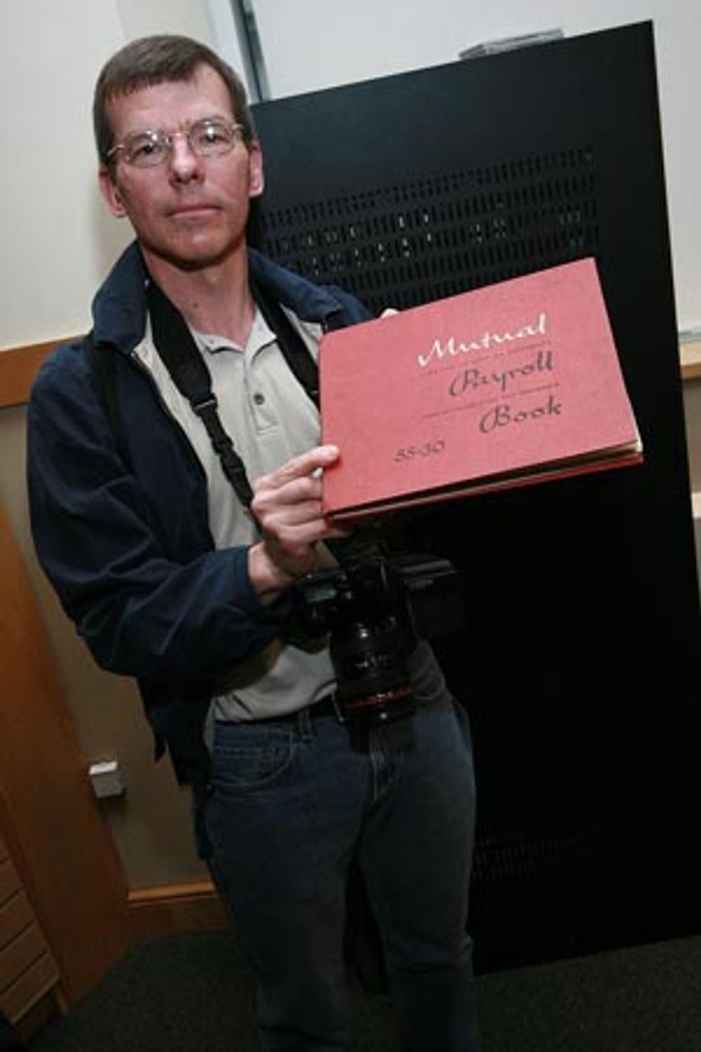 Bill Schroeder with a 1963 payroll ledger from the original production