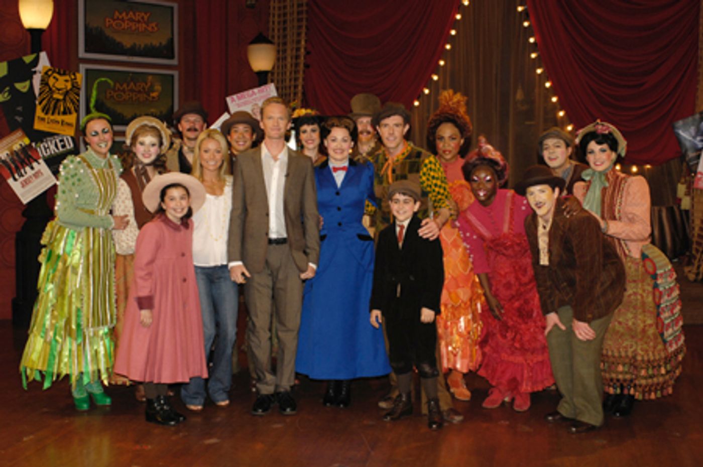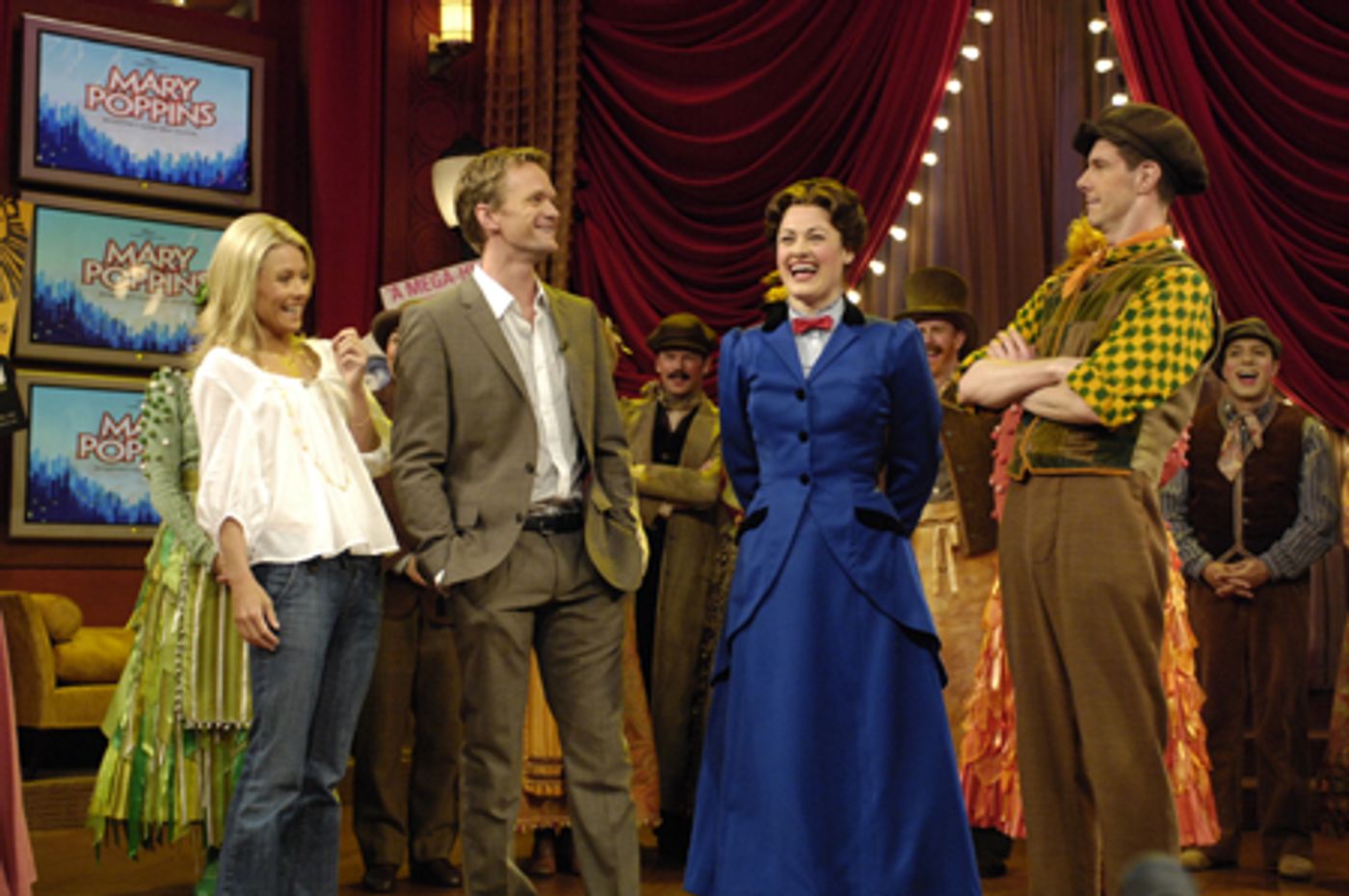 "Live with Regis and Kelly" host Kelly Ripa and guest host Neil Patrick Harris with Ashley Brown, Gavin Lee and the cast of Mary Poppins