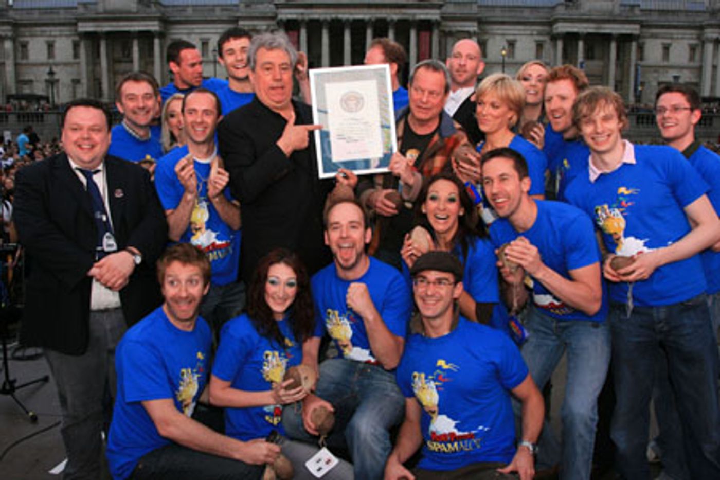 Conducted by Michael England, Spamalot's Musical Director, the Pythons and the Spamalot cast taught a packed Trafalgar Square how to 'clip-clop' in time to the Python classic "Always Look on the Bright Side of Life." The record-breaking attempt, which took place at 7pm, was part of a weekend of free activities organised by the Mayor of London and was followed by a special screening of Monty Python and the Holy Grail. Craig Glenday, Editor in Chief of Guinness World Records, was on hand to officiate. Once the registration forms had been counted and verified he declared that 5,567 members of the public had taken part in the attempt and he congratulated everyone on breaking the official record by 'quite a sizable amount'.