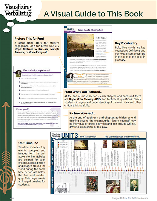 The series uses engaging and interactive methods that incorporate the steps from Bell's Visualizing and Verbalizing (V/V) for Language Comprehension and Thinking program. Throughout the series, Bell's methods help students visualize history, learn new vocabulary, expand critical thinking skills and develop true comprehension for important events, people and places. Vivid photos, fun facts and stories, and imagery-laced writing fill every page. The series satisfies most state and national standards for each grade level; books can be used in classrooms or at home as a primary teaching text or to supplement existing textbooks.