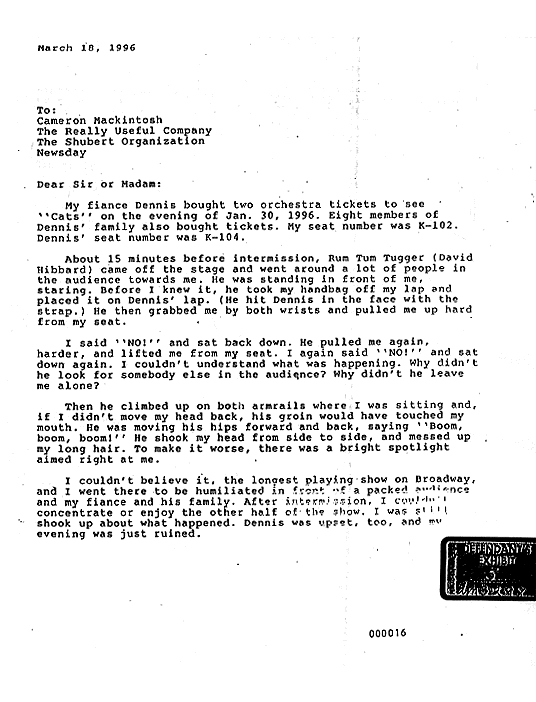 In 1997, a patron of CATS sought $6 million in compensatory and punitive damages after Broadway veteran David Hibbard, who was portraying the cat Rum Tum Tugger, entered into the audience and tried to get a patron to stand and dance with him. The patron refused and Hibbard, in the spirit of a cat, climbed onto her seat's armrests and began pelvic thrusting to the music while exclaiming "Boom! Boom! Boom!" Hibbard, who was presumably dressed in a tight leotard and drenched in sweat from dancing, then briefly played with the patron's hair before leaping off her seat and returning back onto the stage.