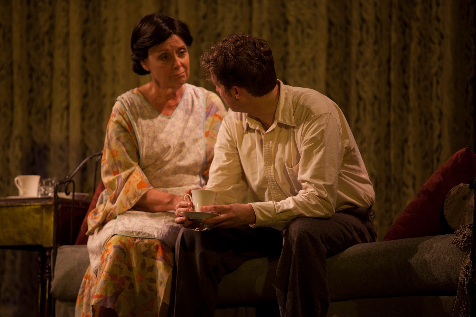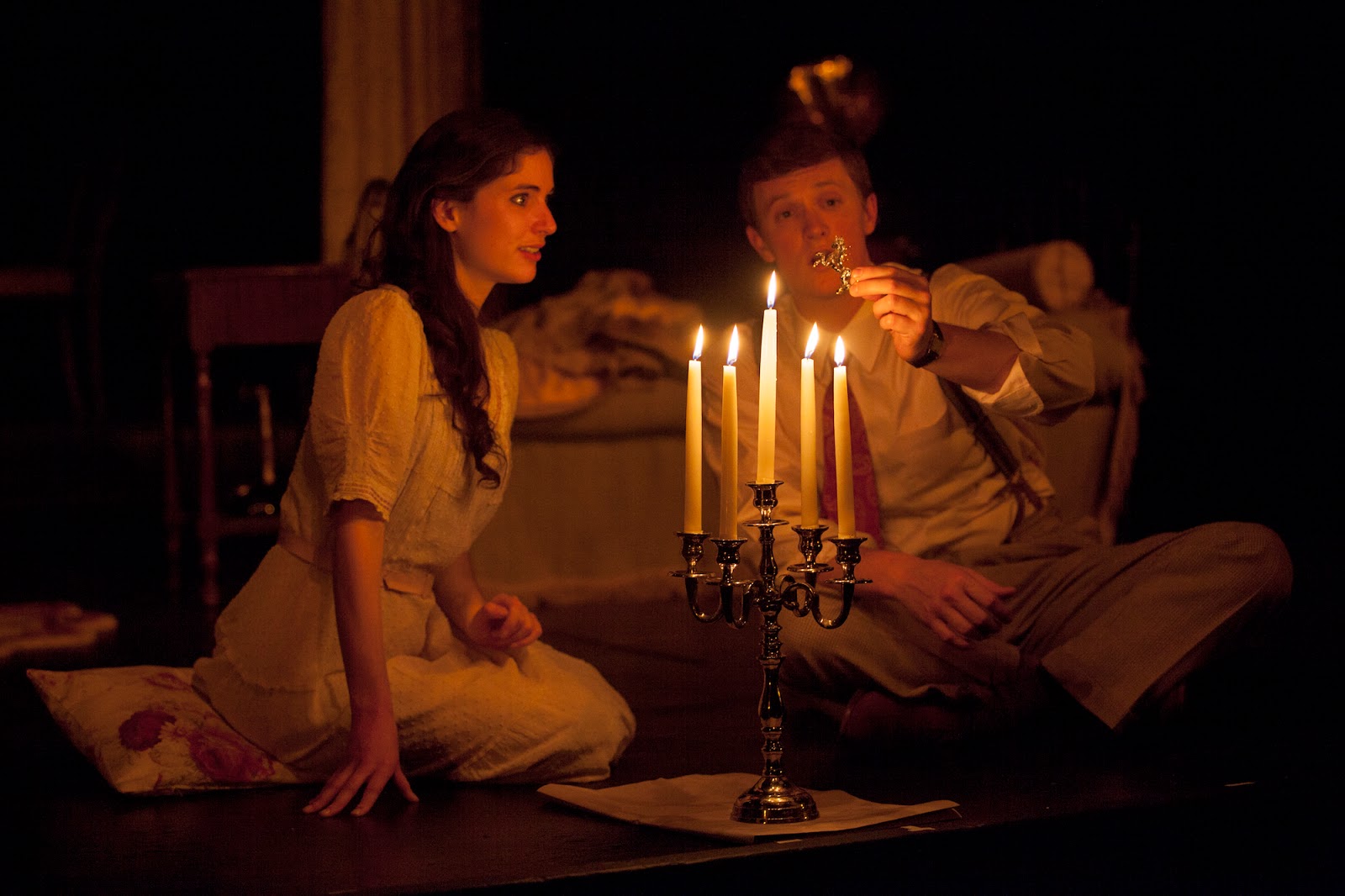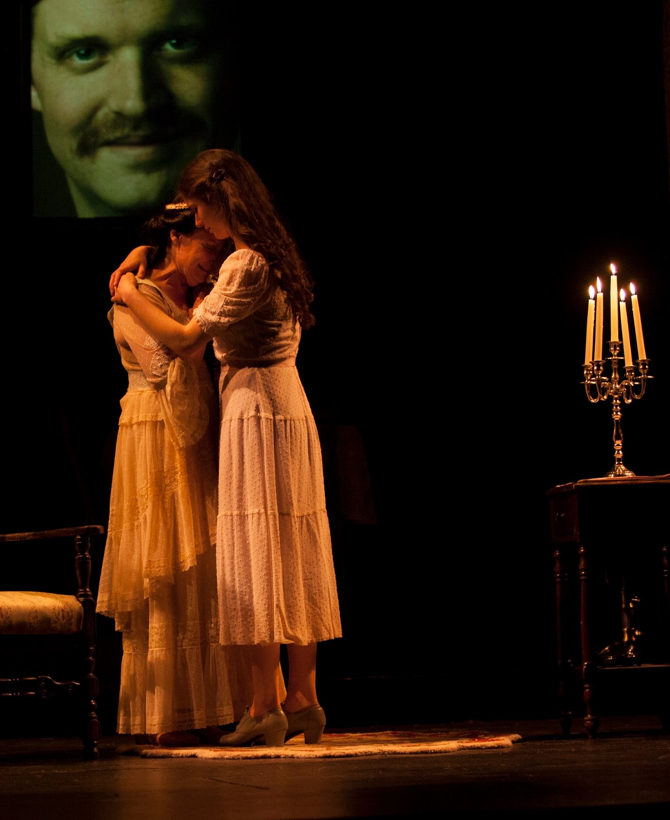 Director Lebano really takes the fantasy element, the flights of fancy, to new levels. Amanda is more seductive than I have ever seen her played when she is trying to make the Gentleman Caller feel at home. She moves in close to him, puts her hand on his leg, almost as if she were snatching him up for herself. As I said earlier, it is a memory play, so Amanda is remembering her joyful days on Blue Mountain and attempting to relive them. Also, the dance between Jim and Laura - lovingly choreographed by Cate Caplin - is big, bold and theatrically elevating, almost like the dream ballet in Oklahoma! and Carousel. Jim lifts Laura up like a ballerina and she literally soars in his arms. A complete transformation has occurred, and within this short period of time, Laura is taken to new heights of self-confidence. All of this is feasible within the context of illusion and magic. I think Williams would love it!