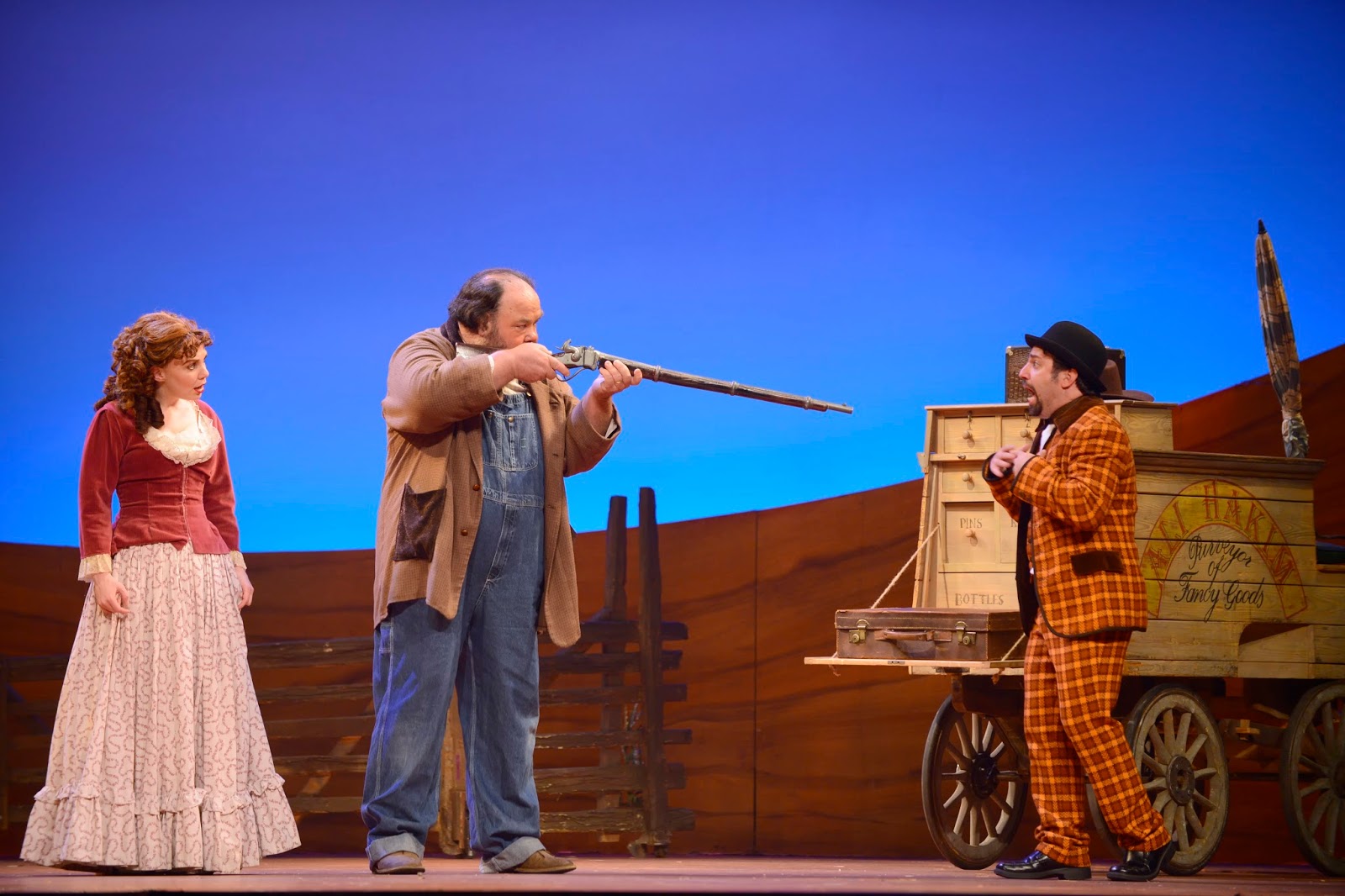 Our country has always been referred to as a melting pot culture. The expression rings in this produciton of Oklahoma! There's Ali Hakim (Drew Boudreau), the traveling peddler, who sets his eyes on Ado Annie (Kelley Dorney). He is Persian. And in this production Jud Fry is African American (played by Rufus Bonds, Jr.). His hidden affections for Laurey (Julia Aks) are not only difficult for her to accept because of his low class, rough and cruel behavior, but being black in 1906 made you ... intolerable. Casting Fry as black adds a whole other dimension to the story. Fry seems beleaguered by previous war injuries and acts out oddly because of them. There may very well be some decency lurking beneath, but bigotry rears its ugly head.