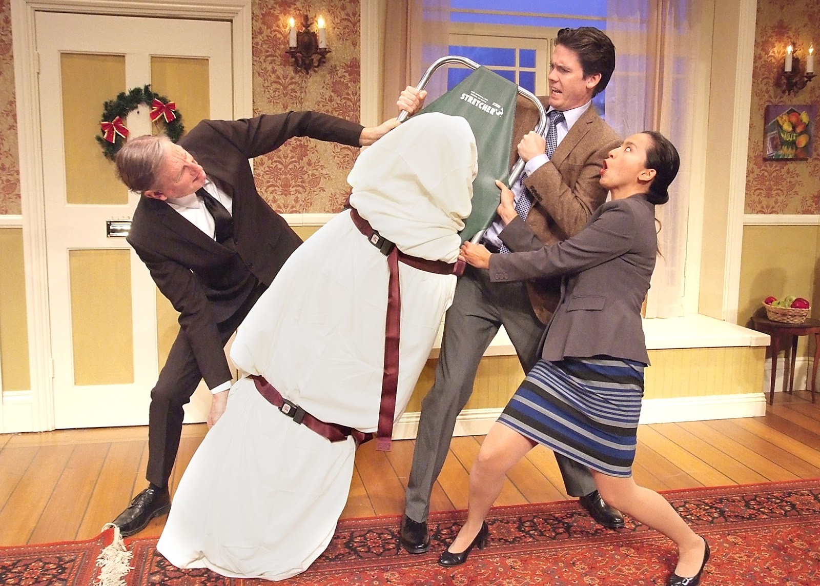 The ensemble playing a variety of eccentric characters under Cooney's keen direction are all great: Mahoney - super with pratfalls, Meader - a real standout in every way, Arcilla, Cardona, Wallace, and Henrietta Meire so sincerely flustered as wife Linda, Ray Cooney uber physically adept and nimble as Uncle George, handsome Michael Sweeney Hammond hysterical as the bewildered Dr. Chapman, Hap Lawrence using character facial expression and large body stance effectively as the oh so proper undertaker and Katie Amess as Norman's innocent, confused fiancee Brenda. There is not a flaw, not a missed cue. No one stands above anyone else. Cooney as director has gleaned a perfect sense of timing from the entire cast.