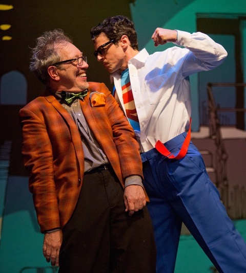 Wham! Pow! Boom! Up and away, it's Superman! Growing up in the 50s I couldn't wait for the next weekly adventure-filled installment of Supie and Lois Lane, Jimmy Olsen, Perry White and the Daily Planet on the small television screen. It was thrilling to see a man go into a telephone booth and change from street clothes into tights - even if they were baggy - and fly off - imagine! - to save the world from crime and destruction. It didn't matter that it was pure fantasy and that he he was only a comic book hero. Superman brought lots of excitement into our young lives. In 1966, the same musical composers who wrote the successful Broadway hit Bye Bye Birdie, Charles Strouse and Lee Adams, penned It's a Bird...It's a Plane...It's Superman! The New Musical Comedy and in spite of the great reviews, it did not catch on with the public, so quickly fizzled. Now 50 years later, what a camp to look back and laugh at all the silliness and innocence of that era, for the Superman musical is loaded with clumsy, goofy, campy laughs. Now onstage in a rare revival ... It's Superman receives a terrifically entertaining production at the Grove Theatre in Upland.