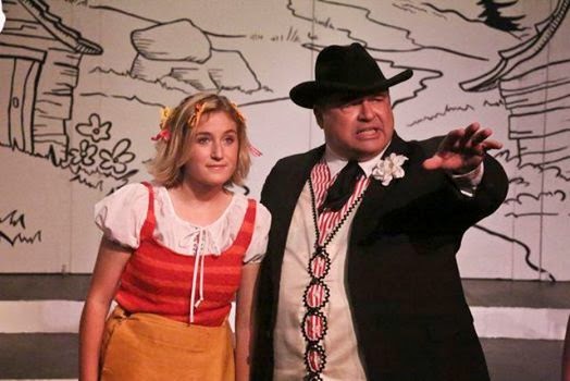 In the guest spotlight are Madison Claire Parks as the voluptuous Daisy Mae and Evan Buckley Harris as Abner. Parks is charming in any role she plays. With her sexy long and curly blonde wig, heavy makeup and skimpy costume, I almost didn't recognize her when she first came onstage. She assumes the character she is playing so well... and sings divinely. Harris is not the hunkiest Abner nor is he innocence personified, but he does have a fine voice and his handsome good looks do fit Abner's devilish egocentricity. John Massey shines as Marryin' Sam. His great comic style is put to great use throughout. Barry Pearl outdoes himself as crooked, greedy General Bullmoose. His Act II "Progress Is the Root of All Evil" is deliciously nasty and dynamically executed. Young Sami Staitman is impressively funny in two small character parts, and Sean Howard completes the guest cast as Mayor Dawgmeat in a small but strong pivotal role.