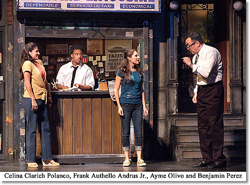 Led by Lano Medina as Usnavi (the role Miranda wrote for himself) the show starts at about 100 mph and never slows down. Usnavi is a fast-talking Dominican grocery-store owner who is everyone's favorite brother, son, you name it. Each day of living in the heights is made better through contact with him, and Medina nails the man's fine sense of humanity. If you don't already know him, by intermission, you want to be his friend. Petite Ayme Olivo makes a beautiful Nina Rosario, intelligent and caring, not unlike Usnavi, but her good fortune lies outside the heights, not within, as she has experienced study at Stanford University. Rachae Thomas is a sultry Vanessa, who, unlike Nina, has less of a chance for self-improvement. She resigns herself to stay, but like most of her friends, rarely lets living get her down. Thomas makes her up, happy, fiery and ready to dance. Tami Dahbura is Abuela Claudia, everybody's favorite grandma. Hailing from Cuba, she reminisces about starry Havana nights, so missing from the New York sky and keeps a strong faith, if not always for herself, at least for everybody else's goodwill. Dahbura's two solos are sung so earnestly and dynamically that they leave an indelible impression. Celina Clarich Polanco and Benjamin Perez are Camila and Kevin Rosario, Nina's parents, who will do just about anything to guarantee a successful future for their daughter. Others completing the cherished mix are Jonathan Arana as Piragua Guy - another great singer, Frank Authello Andrus Jr. as Benny, so in love with Nina yet 'not fitting in', Chala Savino and Anna Gabrielle Gonzalez as Daniela and Carla, Vanessa's jovial partners at the hair salon, whose gossipy and graphically biting humor keep things jumping, kind of like in a Latino TV sitcom. Robert Ramirez is Usnavi's faithful Tonto cousin Sonny and Jose-Luis Lopez , Graffiti Pete, budding artista. Ramirez is a born comic and Lopez, a superior dancer. Suffice to say, the entire company are triple threat performers.