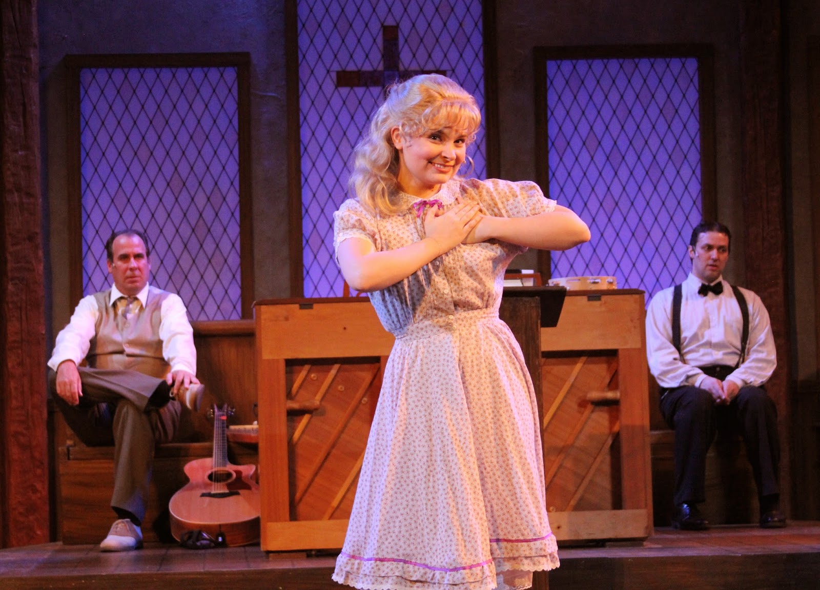 Reverend Mervin Oglethorpe (Jason Webb) invites the Sanders family to his Baptist church to try to bring the congregation - most of us are familiar with how stern, strict and Bible scripture-oriented Baptists are - into a more modern way of thinking. As perfect as they try to present themselves, the Sanders family are high on imperfections. They all possess human frailties which make them less than exemplary Christian models. Eventually through their earnest attempts to talk sincerely about themselves and to sing and move up a storm, though, they win over the audience, which serves as the congregation. The Sanders include Papa Burl (David Kirk Grant), mother Vera (Jennifer Wilcove), Uncle Stanley (Andrew Orbison), daughter June (Renna Nightingale) and twin siblings Denise and Dennis (Kim Dalton and Andrew Wade). Burl has owned a filling station which is going under due to fierce competition from another station that sells beer. As a tea-totler Christian, how can he compete? So, it's back to singing. After a five-year absence from the road, this is their very first gig. Uncle Stanley has had some problems with the law and only recently came back to the family, June has a whole mess of personal problems - she can't sing, so she signs instead, but not following ASL American Sign Language...instead a Godawful program of her own misguided invention. Denise longs to be an actress - she even went to an open call for extras for Gone with the Wind and met David O. Selznick. Act and be a good Christian? Ugh! Dennis has his own hangups but still desires to be a minister. It's a motley group who tell some ridiculously funny stories and then combine musical talents to form a colorful bluegrass orchestra, with guitar, bass, banjo and even including harmonica and a washboard. Oglethorpe eventually chimes in on the accordian.