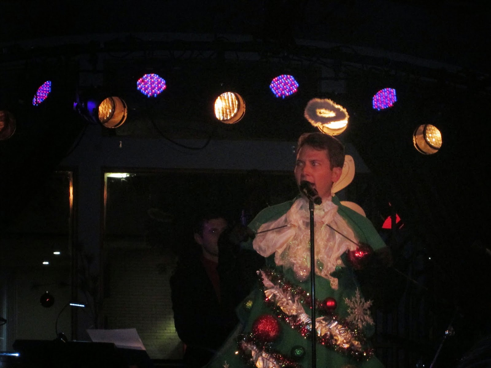 Ryan has a pleasant vocal instrument that he utilizes exceedingly well, by choosing material that suits his style. He loves to make his audience laugh, and is not afraid to switch a lyric here and there to create a comic effect. Take for example the highlight of Shawn Ryan's Merry Little XMas. He comes out dressed as a gaily decorated Christmas Tree (pictured below) with his angelic face protruding from the top and sings "Who Put the Stump?" up my rump.a.bump.a.bump, who put the bush up my tush... the complete effect of which creates gales of laughter and brings down the house. We are reminded of comedy greats who have gone over the top to grab you...and it works.