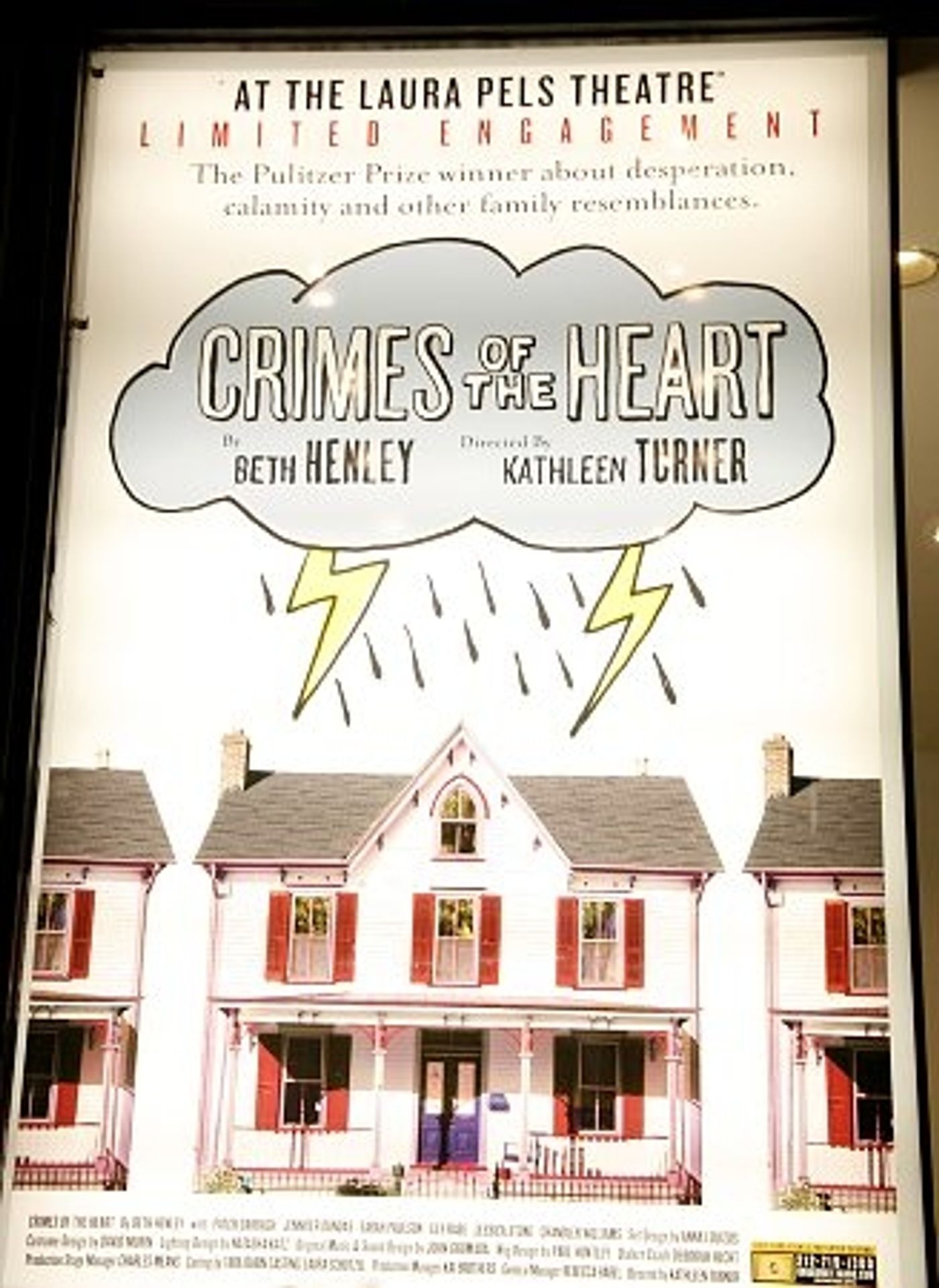 The cast of the Pulitzer Prize winning play Crimes of the Heart, written by Beth Henley and directed by Kathleen Turner, features Patch Darragh (Doc Porter), Jennifer Dundas (Lenny Magrath), Sarah Paulson (Meg Magrath), Lily Rabe (Babe Botrelle), Jessica Stone (Chick Boyle) and Chandler Williams (Barnette Lloyd).