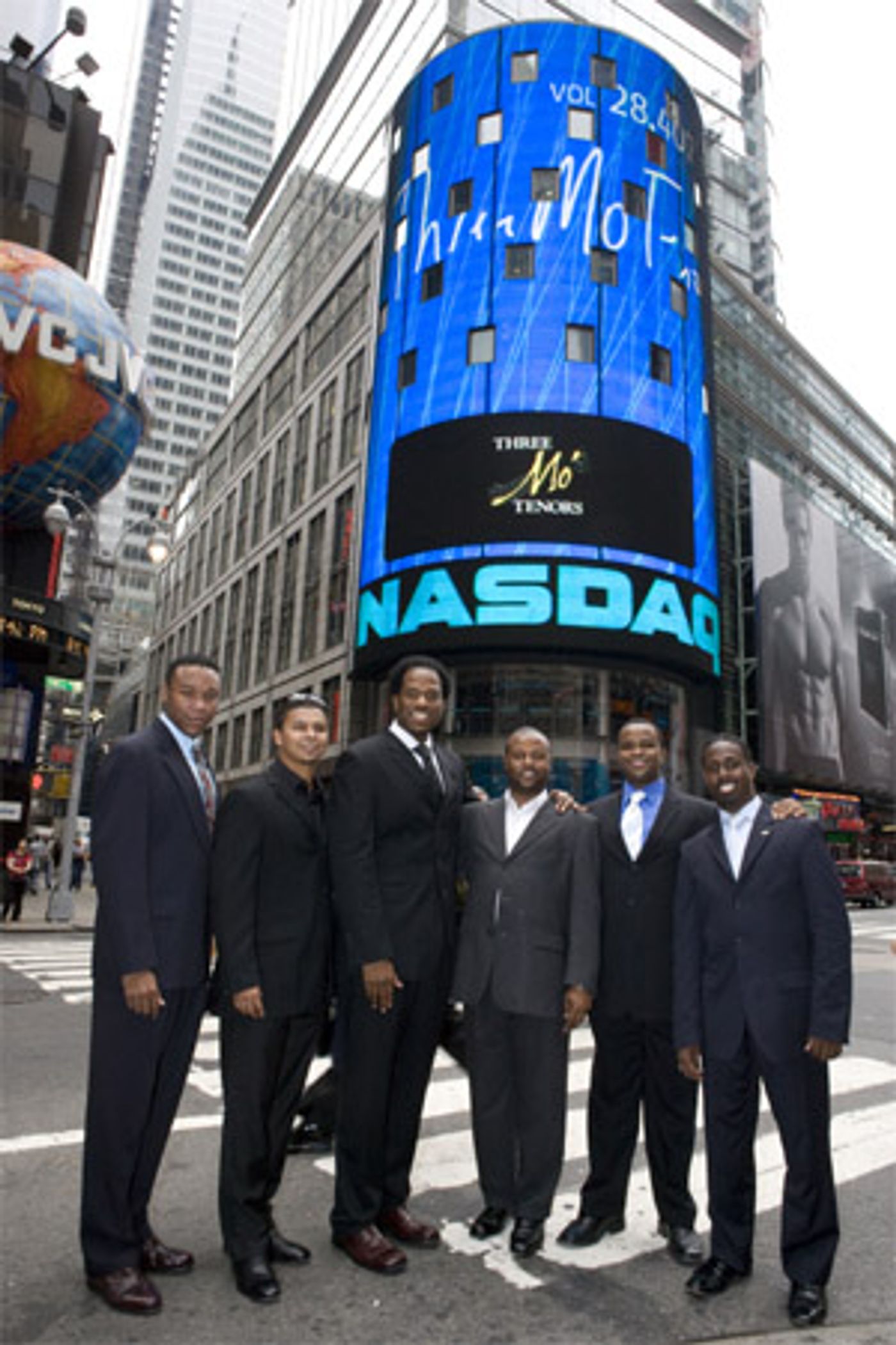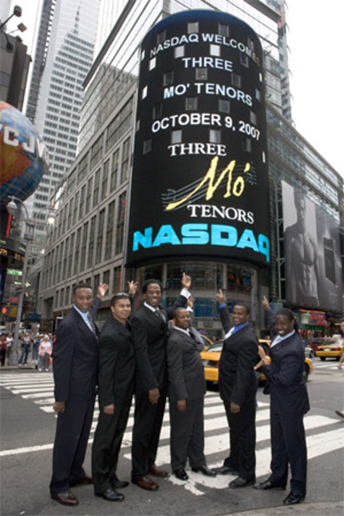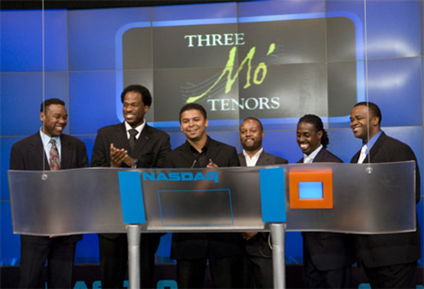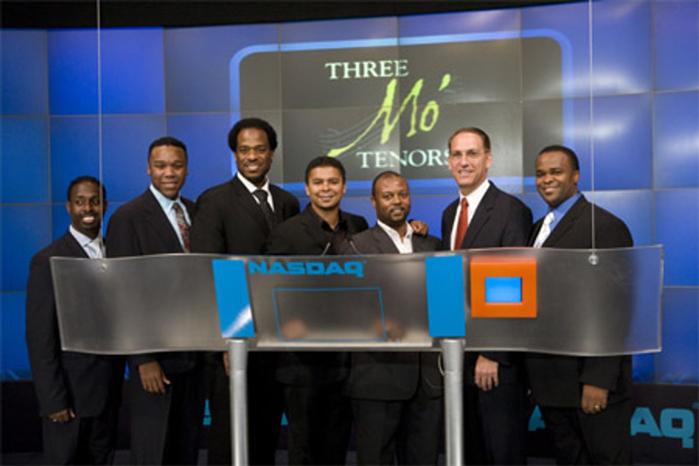 Three Mo' Tenors (Kenneth Alston, Jr., James Berger, Ramone Diggs, Sean Miller, Victor Robertson, Phumzile Sojola) celebrated their New York engagement at The Little Shubert Theater by ringing the closing bell at the NASDAQ Stock Market on Tuesday, October 9 at 8:45AM at the NASDAQ Stock Exchange, 4 Times Square.